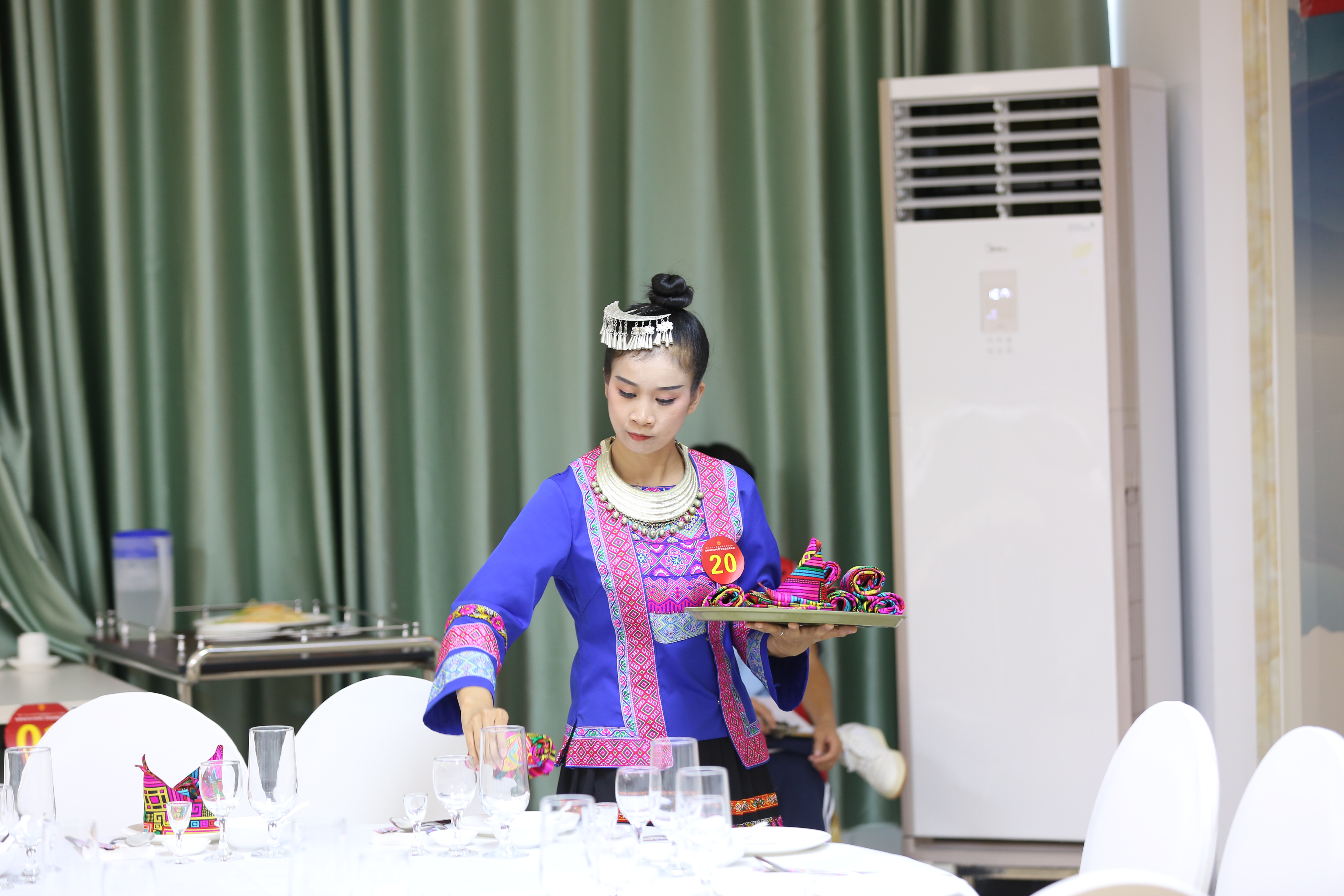 餐厅服务员实操考核要求选手在餐桌上为客人提供个性化菜肴和饮料服务,并能独立完成宴会设计、装饰、布置、菜单安排、酒水服务、菜肴服务。餐饮部黄诗佳、黄兴丽凭借精湛的专业技能和创新思维分别荣获优胜奖第五名、第六名。
