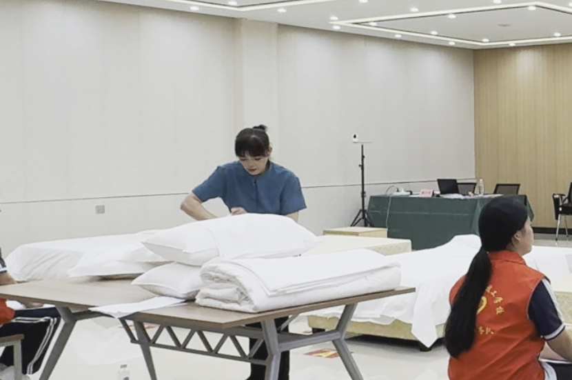客房服务员实操考核主要考核选手运用相关知识和技能,独立完成客房中式铺床、主题开夜床服务。房务部罗后菊荣获第三名,李艳群荣获优胜奖第五名。